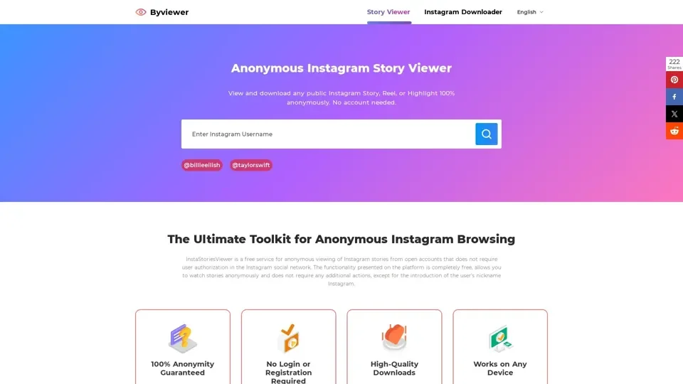 View and download any public Instagram story, profile, or post 100% anonymously. With Byviewer, it's ✅ 100% Free & Fast and ✅ No Login Required!